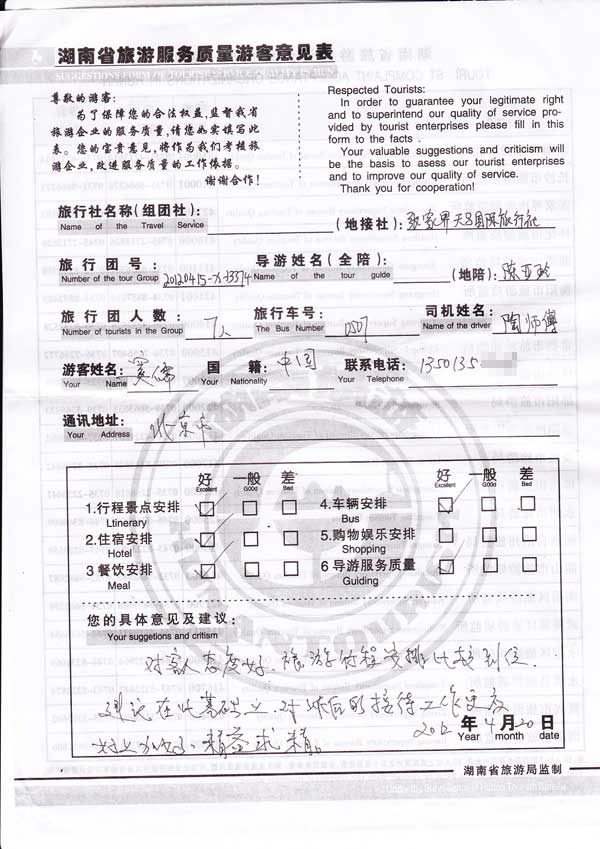 (导游)对游客态度好,旅游行程安排比较到位,建议在此工作基础上, 对以后的接待工作更应好上加好,精益求精。[旅游回顾]北京窦先生一行7位来张家界旅游,参加我社组织的张家界凤凰古城三日游行程,并游玩的非常开心,对行程、导游的安排和服务,很满意。并提出希望,建议我们以后的接待工作应更好,对此非常感谢窦先生对我社的信任和良好建议,我们会一直努力。