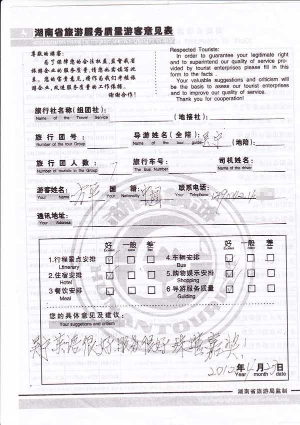 吴宁英语很好,服务很好,殊堪嘉奖[旅游回顾]方先生一行7位(其中有华侨数人)抵达张家界,参加我社组织的VIP包团服务,对吴宁导游的热情服务及专业程度表示赞赏。