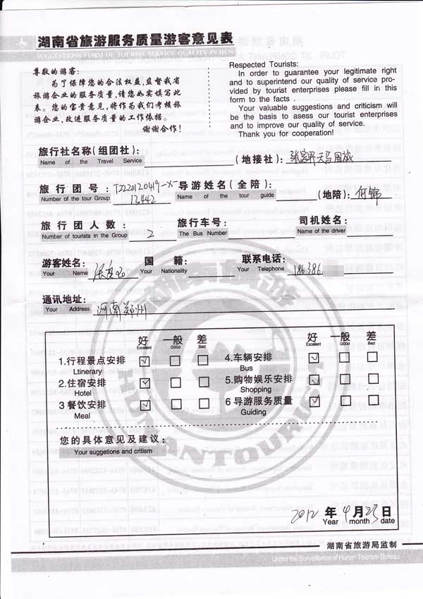 我们在填写反馈扫描时,将游客的姓名及联系方式做部分处理,全力保障您的个人隐私。