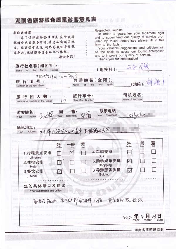 服务态度好,各方面安排都不错,一路上较轻松[旅游回顾]广州天河区江女士一行16位参加我社组织的旅游团,本地旅行由我社导游胡腊月带领,江女士对导游的服务及行程安排都比较满意,另外对我社的行程景点安排认为更应该精益求精,提高休闲度,对此我社非常感谢江女士的信任和良好建议,将逐步提高张家界五日游行程安排的休闲度,服务更多的游客。