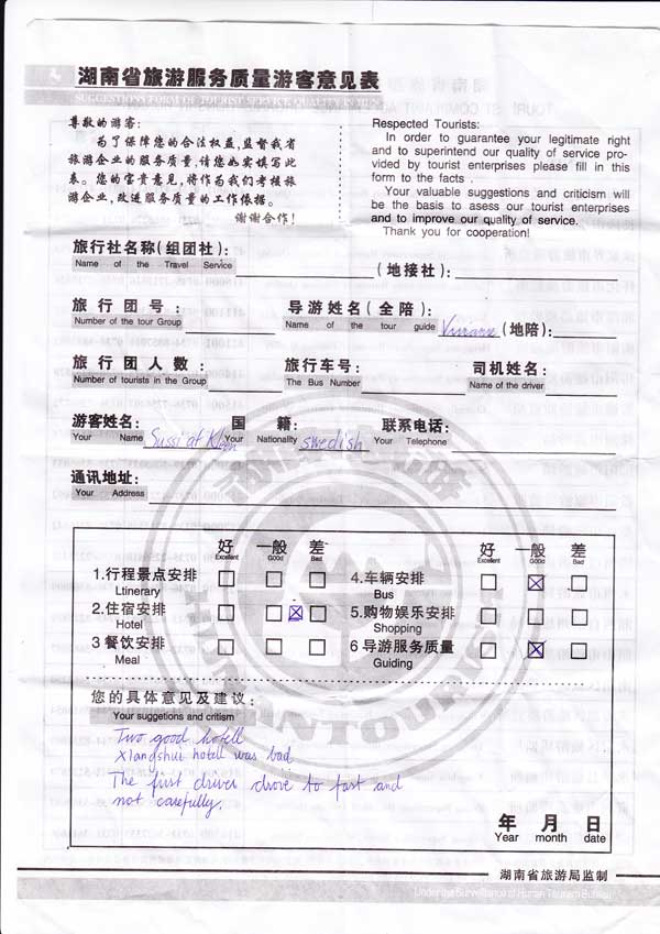 Two good hotel, Xiangshui hotel was nad ,The first ...瑞典游客Sussi af Kleen一行4位不远万里抵达中国,参加我社组织的张家界VIP包团四日游,对整个行程与导游服务安排非常满意,对行程中的湘水宾馆认为是旧的,对整个旅行的用车安排认为一般,对此我社表示感谢其对我们的信任,同时将会以后安排更好的酒店,服务游客,希望您再来美丽的张家界旅游。