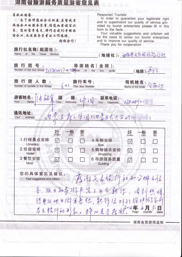 感谢天马旅行社的安排与服务,派出的导游严兰兰业务熟练,周到热情,设身处地的为游客着想,能够很好的维护游客利益与旅行社形象,特此表示感谢。[旅游回顾]我社非常感谢张先生对我社的信任与评价,导游严兰兰及我们将会继续努力,为游客提供高品质服务。