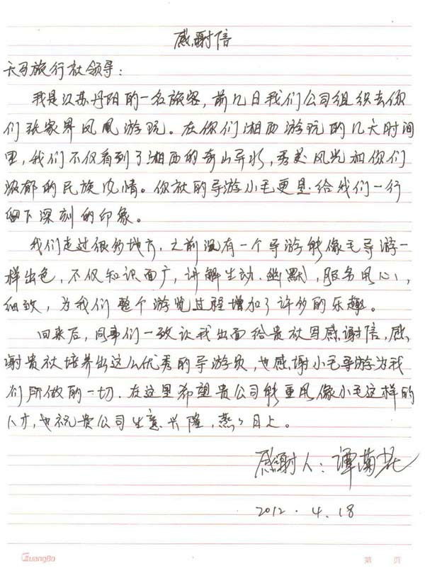 来自丹阳游客的感谢信,感谢我社导游毛春武带团的认真负责及专业,让游客感受到前所未有的良好旅游体验。