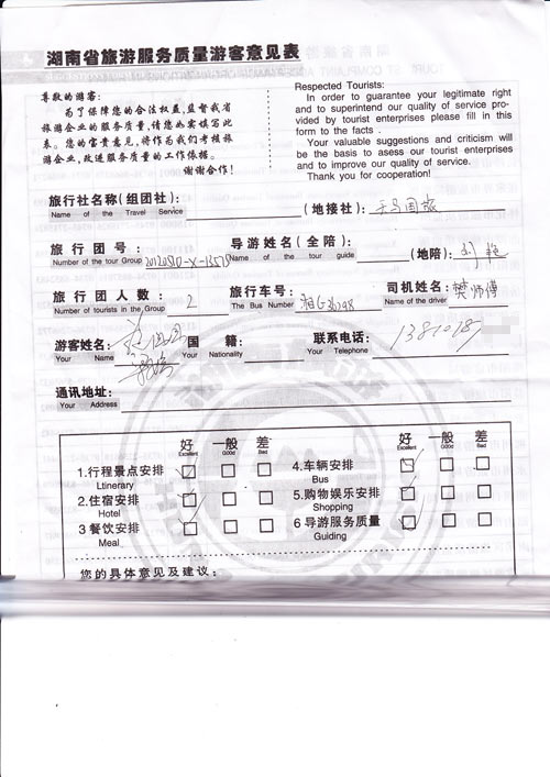 导游服务水平高,热情专业。[旅游回顾]北京施先生梁女士一行2位参加我社组织的VIP张家界包团服务,对我社的各项服务都很满意,对我社导游的热情服务非常满意。