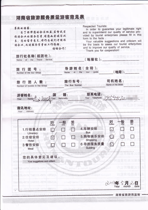 很满意,无意见。[旅游回顾]湖南省长沙游客赵女士一行抵达张家界,参加我社组织的独立包团服务,对我社的服务和导游都非常满意,无意见。
