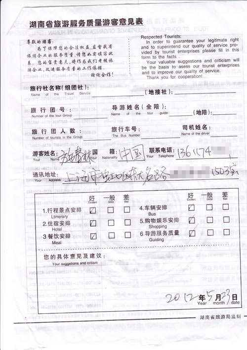 很满意,无意见。[旅游回顾]上海施先生一行6位抵达张家界,参加我社组织的旅行团队,对我社的服务非常满意,无意见。