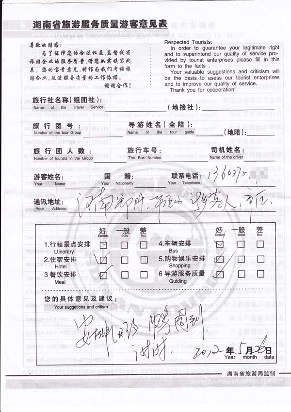 安排很好,服务周到,谢谢。[旅游回顾]河南郑州游客一行11位抵达张家界,参加我社组织的三日游独立包团服务,对我社的安排非常满意,并非常感谢客服的服务,对此我社感谢对我社的信任,欢迎再来美丽的张家界旅游。