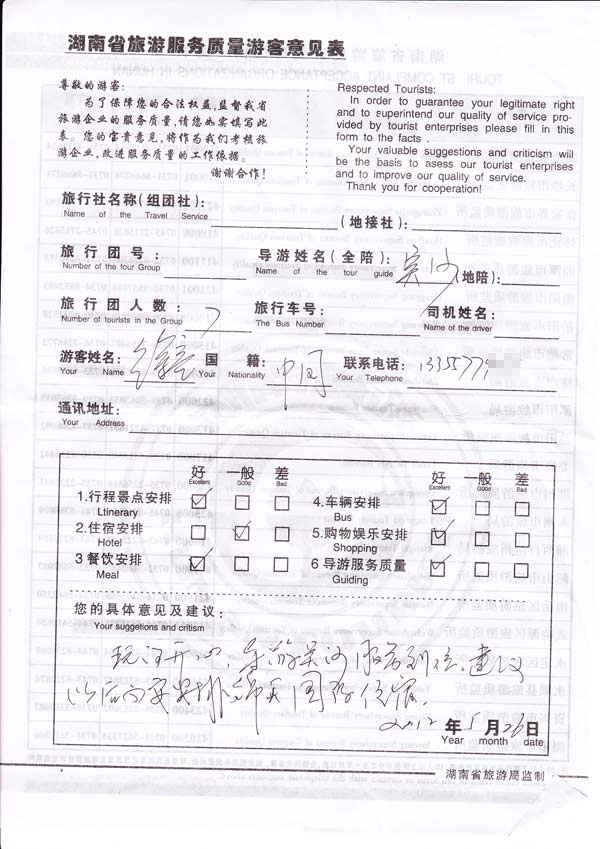 玩的开心,导游吴沙服务到位,建议以后安排锦天国际的住宿。[旅游回顾]浙江温州徐先生一行7位参加我社组织的VIP包团服务,对我社导游吴导的服务非常满意,并希望我社以后安排的酒店住宿都安排锦天国际酒店类型。对此我社感谢吴先生的建议,另外凤凰古城的酒店并无挂牌四星酒店,和锦天确实存在一些差距,敬请谅解。