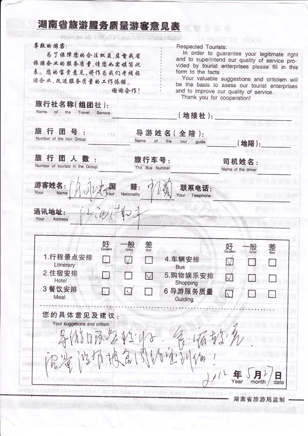 导游服务较好,食宿较差,质量没有按合同约定到位。[旅游回顾]江西南昌陈先生一行6位抵达张家界,参加我社组织的四日游旅行,导游服务较满意,对住宿和餐饮安排不是很满意,对此我社非常抱歉,我们确实是按合同规定的住宿与食宿标准来给您安排,如未达到您的旅行标准,我社客服建议提高住宿标准的建议,希望您采纳,相信会有一个更好的旅行。对您的建议非常感谢,欢迎再来美丽的张家界旅游。