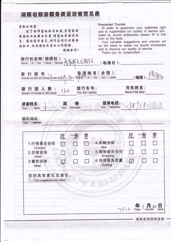 很满意,无意见。[旅游回顾]陕西西安游客王先生一行13位张家界旅游质量反馈,各项服务比较满意,感谢对我们的信任并选择我社的服务,欢迎再来美丽的张家界旅游。