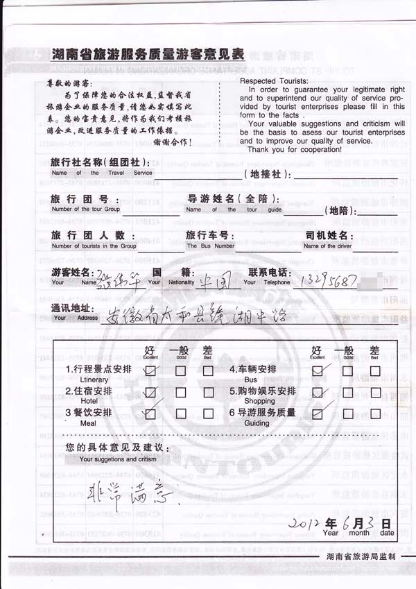 非常满意。[旅游回顾]安徽张先生一行抵达张家界,参加我社组织的包团服务,对我们的各项服务都非常满意,感谢张先生的信任和选择,欢迎再来美丽的张家界旅游。