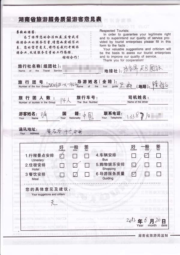 无意见,很满意。[旅游回顾]湖北黄石王先生一行14位教师抵达张家界,参加我社组织的旅游团队,游玩中开心,并希望我社在安排住宿、用车方面,多加改进并加强管理。感谢您对我们的信任,我们将在团队用车方面,严格按照您的要求来操作,旅游前将加强与游客的沟通。谢谢。