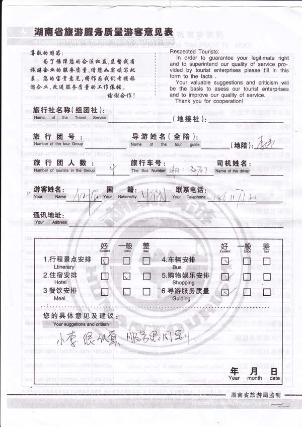 小李很认真,服务很周到。[旅游回顾]北京何先生一行4位抵达张家界,参加我社组织的张家界三日游包团服务,对小李的认真周到服务表示感谢。感谢何先生对我社的好评,欢迎再来美丽的张家界旅游。