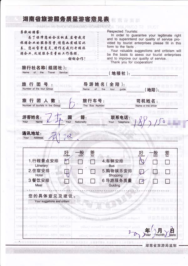 很满意,无意见。[旅游回顾]武汉王先生一行6位抵达张家界,参加我社组织的张家界凤凰古城独立包团服务,对我社的住宿安排、导游安排、行程安排都较满意,无意见。欢迎再次来张家界旅游。