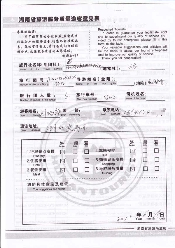 很满意,无意见。[旅游回顾]湖北刘先生一行6月初确定张家界三日游的旅行行程,由我社导游毛映雪负责带领,整个旅行非常开心顺利。感谢刘先生对我社的信任和支持,欢迎再来美丽的张家界旅游。