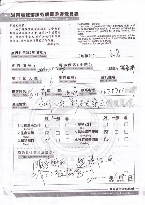 服务周到,热情活泼,我们很满意。[旅游回顾]浙江马先生一行7位来张家界旅游,参加我社组织的四日游旅行,对我是导游及客服的热情服务非常满意。