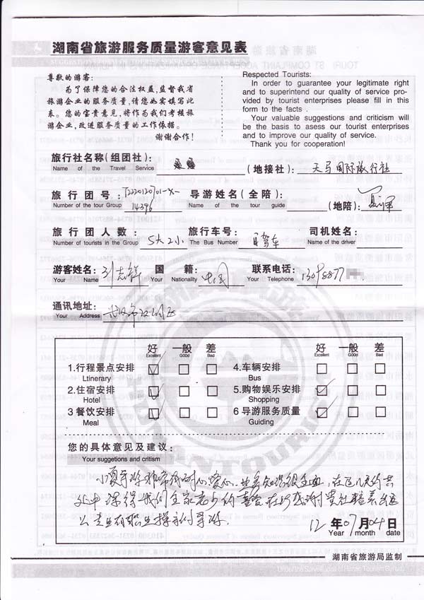 小夏导游非常有耐心、爱心,业务知识很全面,在这几天的共处中,深得我们全家老少的喜爱,在此感谢贵社培养出这么专业有职业操守的导游。【我社回复】感谢刘先生一行对我社导游的高度评价,感谢对我社的信任和支持,欢迎再来美丽的张家界旅游。