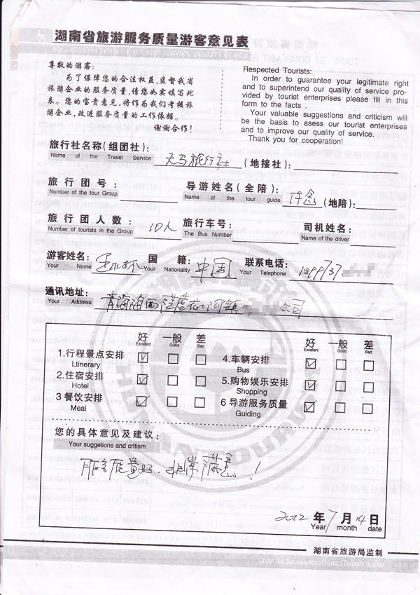 我们在填写反馈扫描时,将游客的姓名及联系方式做部分处理,全力保障您的个人隐私。
