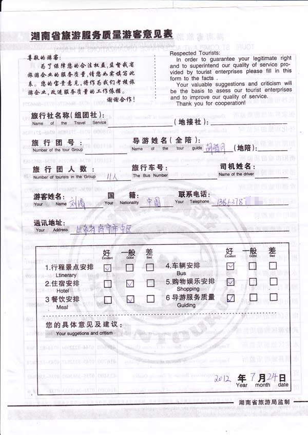 无意见,很满意。[我社反馈]感谢刘女士一行对我社信任及良好评价, 欢迎再来美丽的张家界旅游。