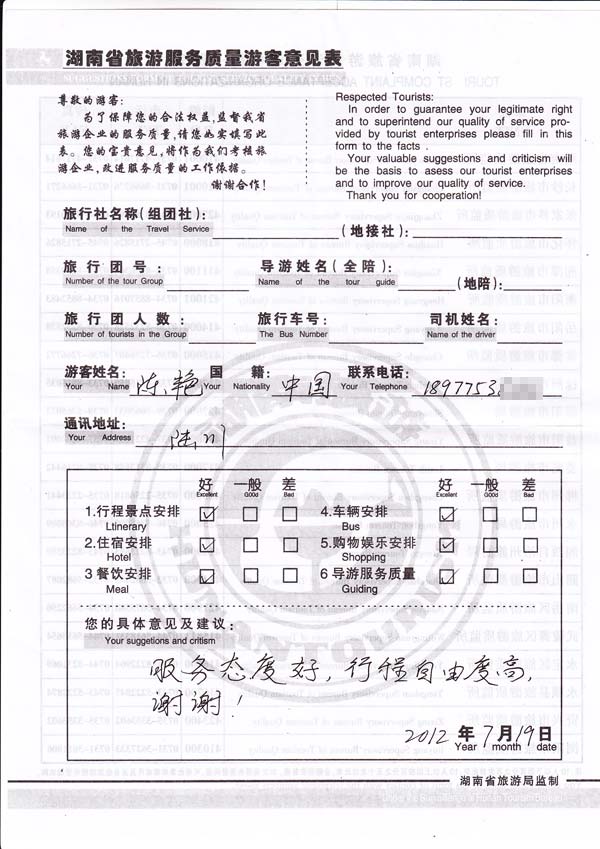 服务态度好,行程自由度高,谢谢.[我社反馈]感谢陈艳女士参加我社组织的旅行团及对我们服务的良好评价,欢迎再来美丽的张家界旅游。