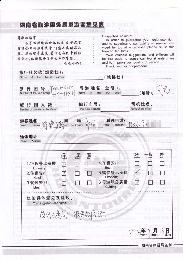 我们在填写反馈扫描时,将游客的姓名及联系方式做部分处理,全力保障您的个人隐私。