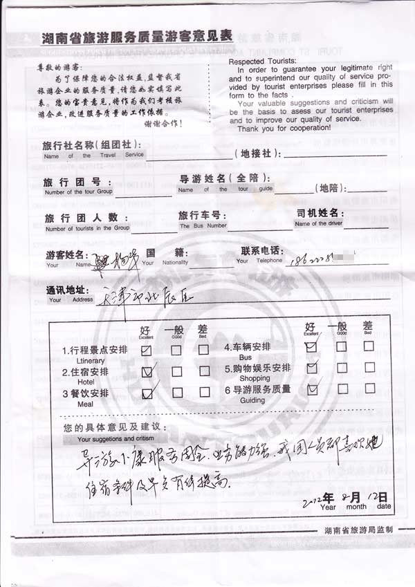 我们在填写反馈扫描时,将游客的姓名及联系方式做部分处理,全力保障您的个人隐私。