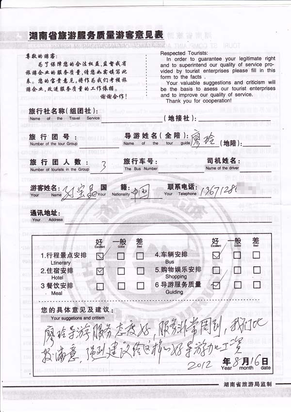 廖玲导游服务态度好,服务非常周到,我们比较满意,强烈建议给这样的好导游加工资。[我社回复]孙先生您好,感谢您对我社导游的良好评价,希望您下次再来美丽的张家界旅游,我们天马国旅,给导游带团都有相应工资及补贴的,这样可以让导游可以有更好的带团环境,给游客更好的旅行体验。