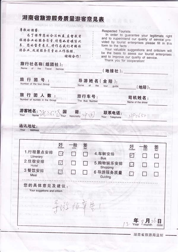 导游很辛苦。[我社反馈]感谢您对我社的信任与选择,感谢对导游的关心,导游工作确实比较累,常年累月的带团,张家界旅行又以山地观光为主,对导游的体力提出了更高的要求,您对导游及我社各项安排的满意,就是对我们的最大鼓励。谢谢。