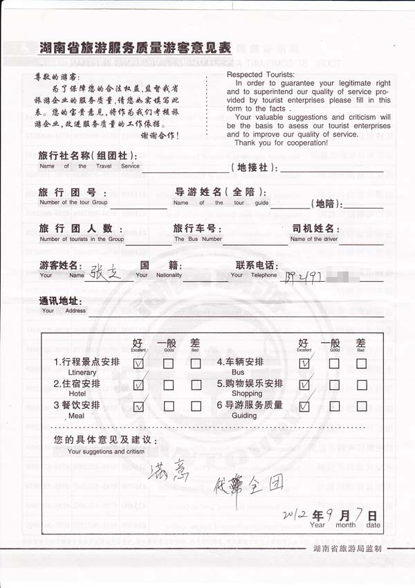 游客反馈扫描图: