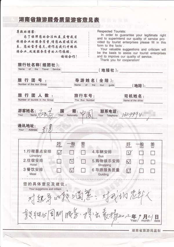 对赵导比较满意,对我们老年人较细心周到服务,提出表扬。[我社反馈]感谢石女士一行参加我社组织的旅行团队,并感谢好评,欢迎再来美丽的张家界旅游。
