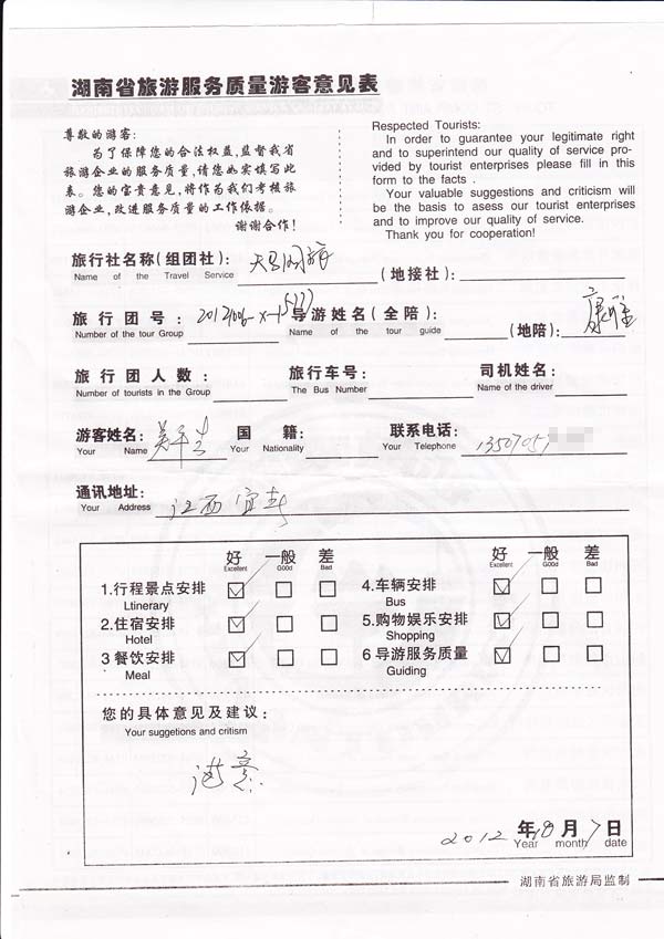 游客反馈扫描图: