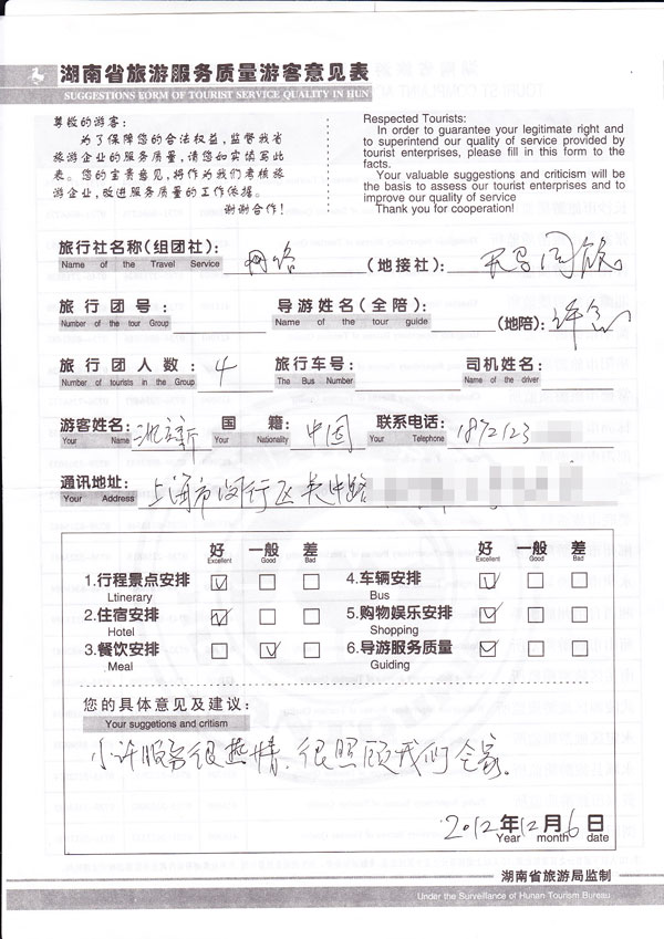 我们在填写反馈扫描时,将游客的姓名及联系方式做部分处理,全力保障您的个人隐私。