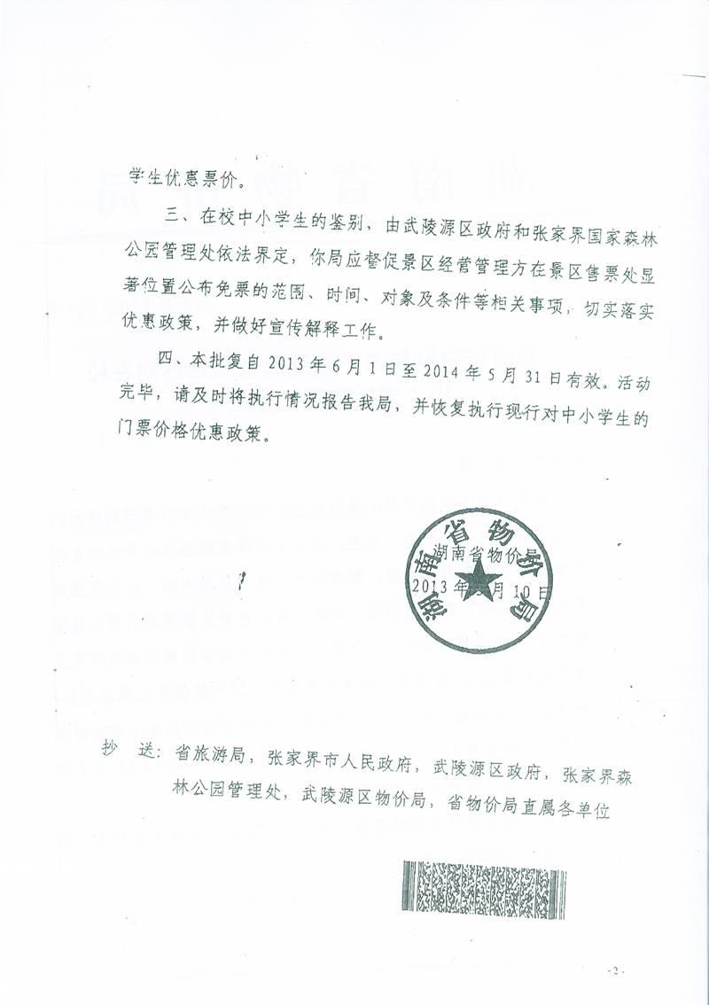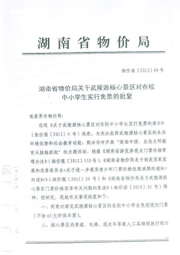 关于武陵源核心景区对在校中小学生实行免票的批复
